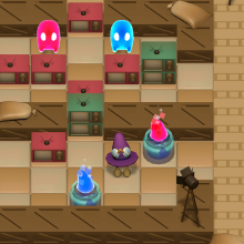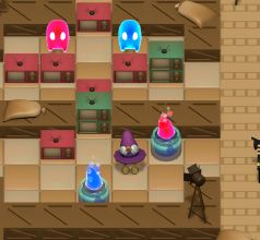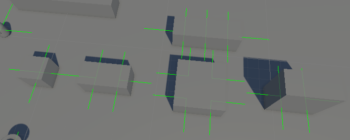 Pictured above is the Raycasting system the Player, Ghosts and Blocks use to detect walls and pushable objects. The system works by checking recursively in the direction that the player is pushing towards, seeing if any of the rays reaches a wall or a block that they can't push. This data was then returned to the player, containing if they could or couldn't push in the desired direction and what blocks they should push.