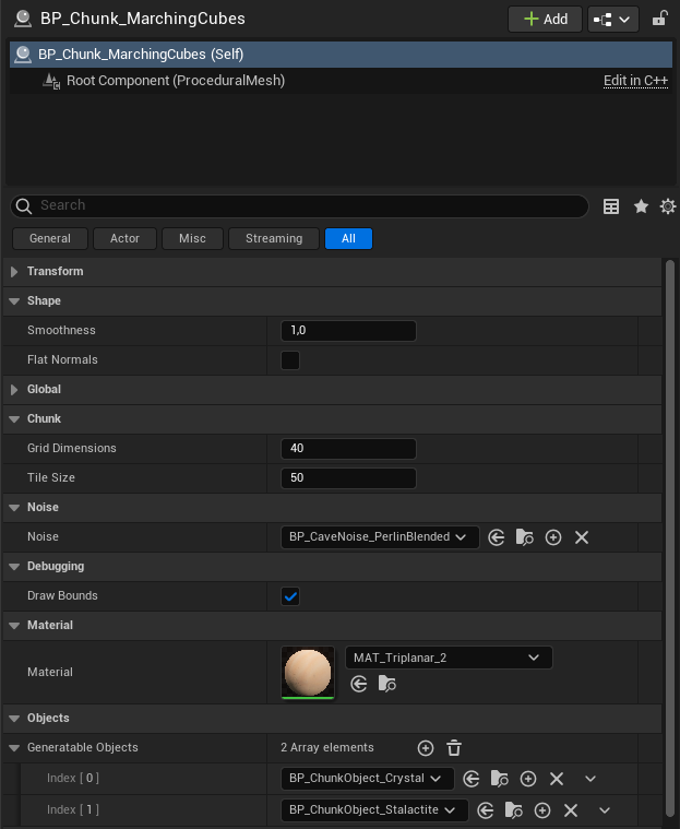Otherwise, I would also like to optimize the logic behind infinite generation and create a more complex system. This is something I would easily be able to do in one of our Custom Engines, but as it's Unreal I seem to be bound to the limits of their Procedural Mesh Component. But surely there is a better integration in Unreal which allows for faster mesh generation. The current system also doesn't save what's been generated, meaning that the mesh will be the same but the objects will be totally different and all the terrain edits will be forgotten.