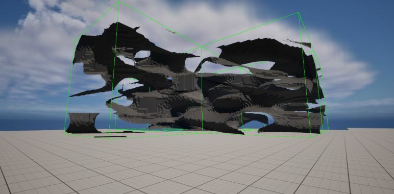 In the End the Tool would generate a Cave inside a Cube-Volume with multiple exposed parameters to allow the user to customize their caves. By using 3D perlin noise this cave would easily be able to generate further from the origin and be divided into separate chunks.